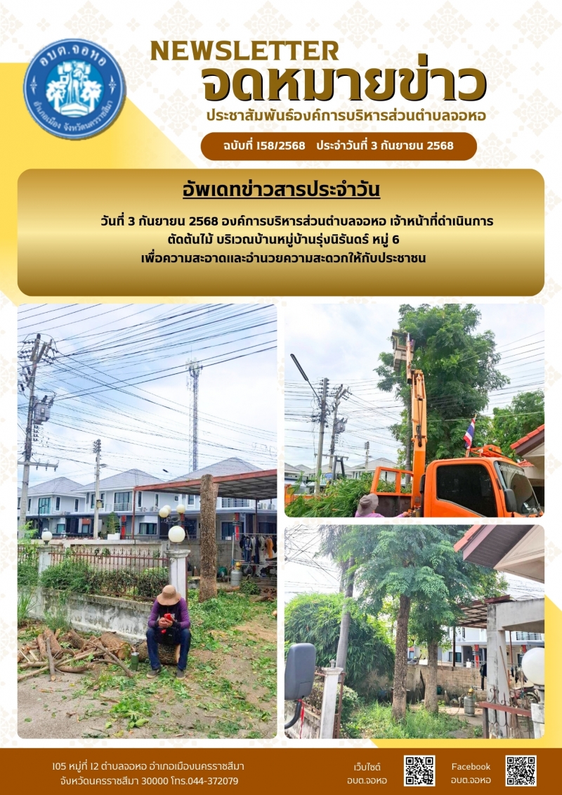 องค์การบริหารส่วนตำบลจอหอ ขอเผยแพร่ ข้อมูล ข่าวสาร กิจกรรม ผลการดำเนินงาน ขององค์การบริหารส่วนตำบลจอหอ ดังนี้ จดหมายข่าว ฉบับประจำวันวันที่ 3 กันยายน 2568