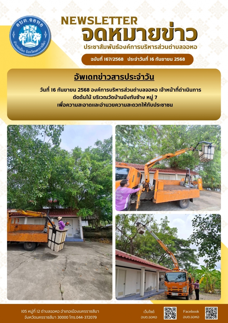 องค์การบริหารส่วนตำบลจอหอ ขอเผยแพร่ ข้อมูล ข่าวสาร กิจกรรม ผลการดำเนินงาน ขององค์การบริหารส่วนตำบลจอหอ ดังนี้ จดหมายข่าว ฉบับประจำวันวันที่ 16 กันยายน 2568