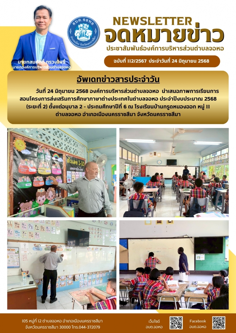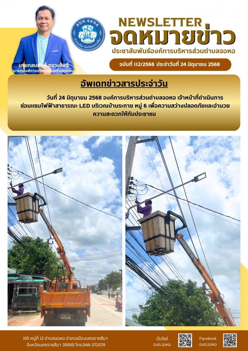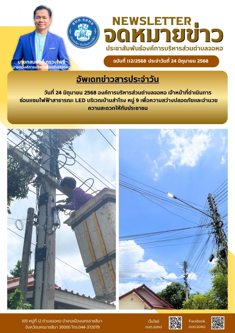องค์การบริหารส่วนตำบลจอหอ ขอเผยแพร่ ข้อมูล ข่าวสาร กิจกรรม ผลการดำเนินงาน ขององค์การบริหารส่วนตำบลจอหอ ดังนี้ จดหมายข่าว ฉบับประจำวันวันที่ 24 มิถุนายน 2568