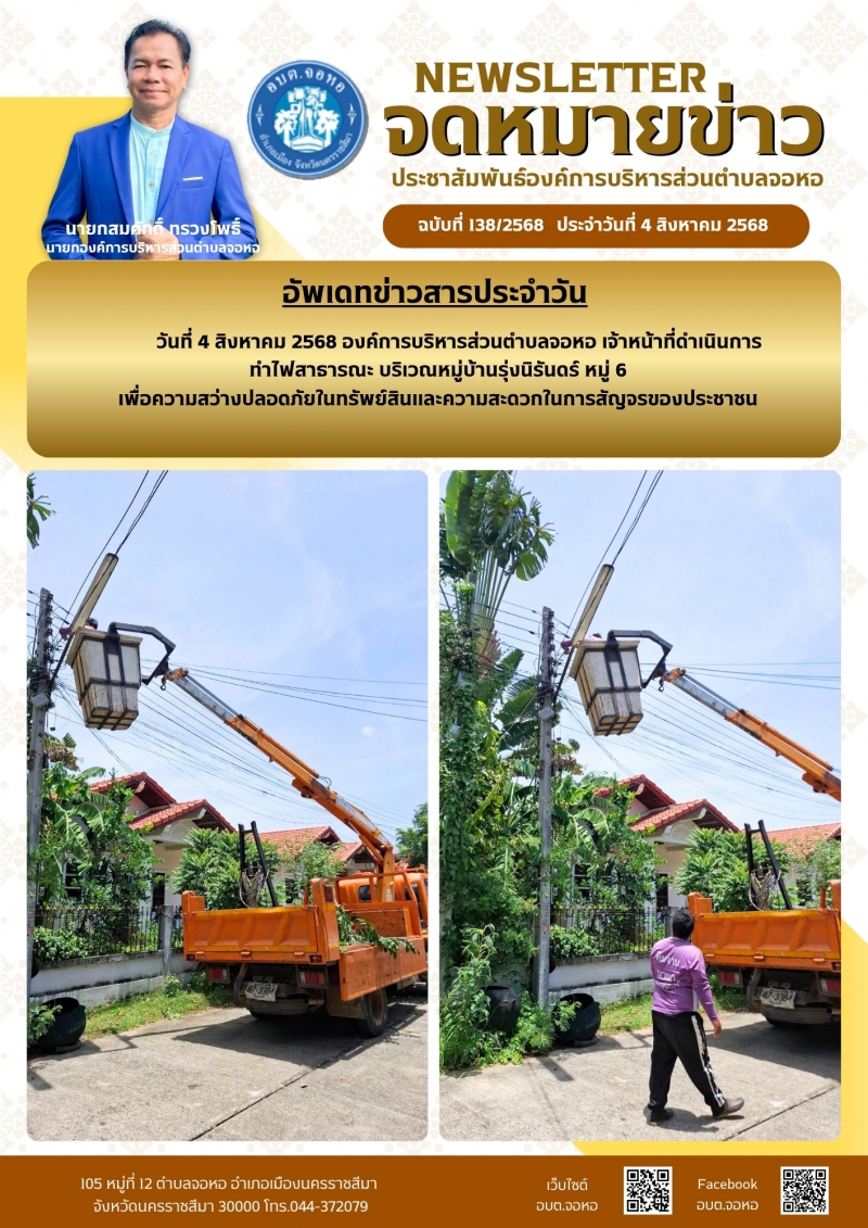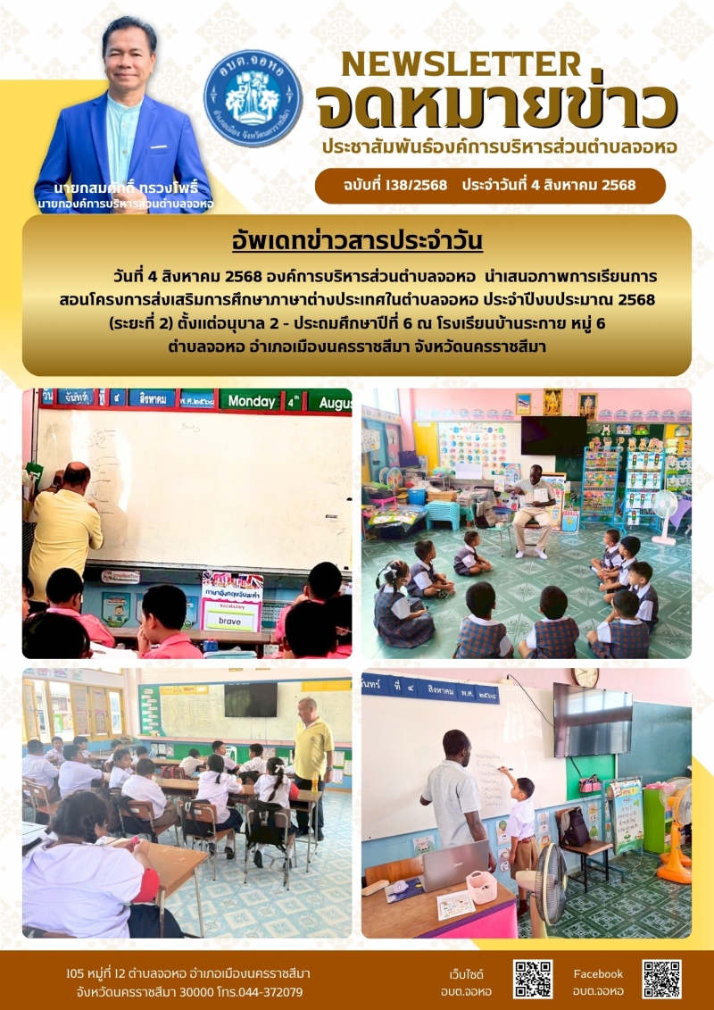 องค์การบริหารส่วนตำบลจอหอ ขอเผยแพร่ ข้อมูล ข่าวสาร กิจกรรม ผลการดำเนินงาน ขององค์การบริหารส่วนตำบลจอหอ ดังนี้ จดหมายข่าว ฉบับประจำวันวันที่ 4 สิงหาคม 2568