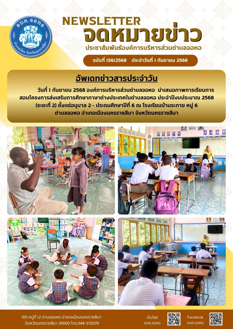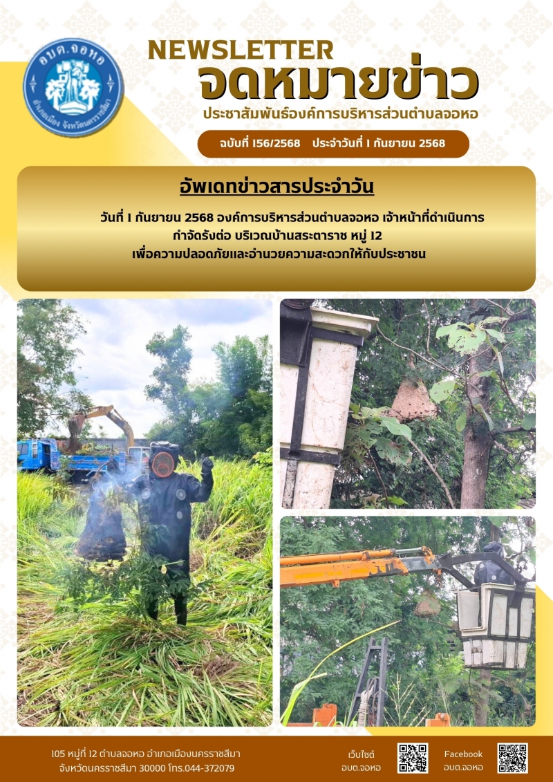 องค์การบริหารส่วนตำบลจอหอ ขอเผยแพร่ ข้อมูล ข่าวสาร กิจกรรม ผลการดำเนินงาน ขององค์การบริหารส่วนตำบลจอหอ ดังนี้ จดหมายข่าว ฉบับประจำวันวันที่ 1 กันยายน 2568