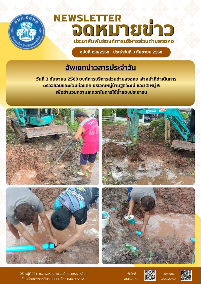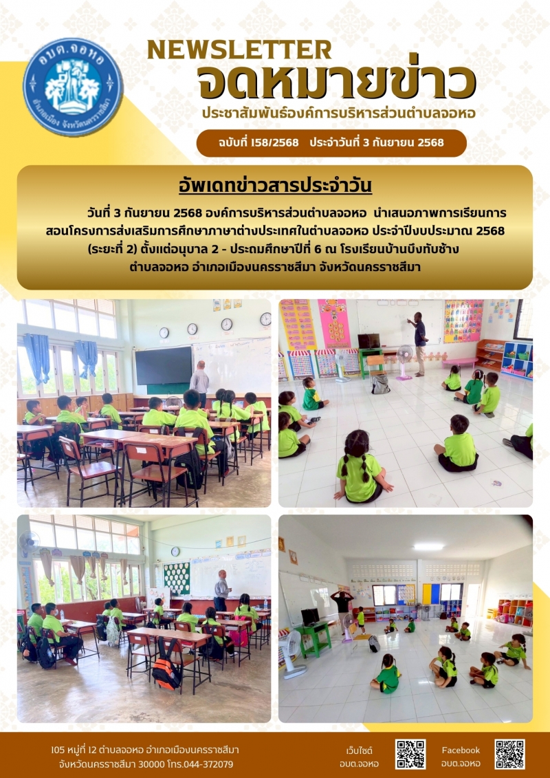 องค์การบริหารส่วนตำบลจอหอ ขอเผยแพร่ ข้อมูล ข่าวสาร กิจกรรม ผลการดำเนินงาน ขององค์การบริหารส่วนตำบลจอหอ ดังนี้ จดหมายข่าว ฉบับประจำวันวันที่ 3 กันยายน 2568