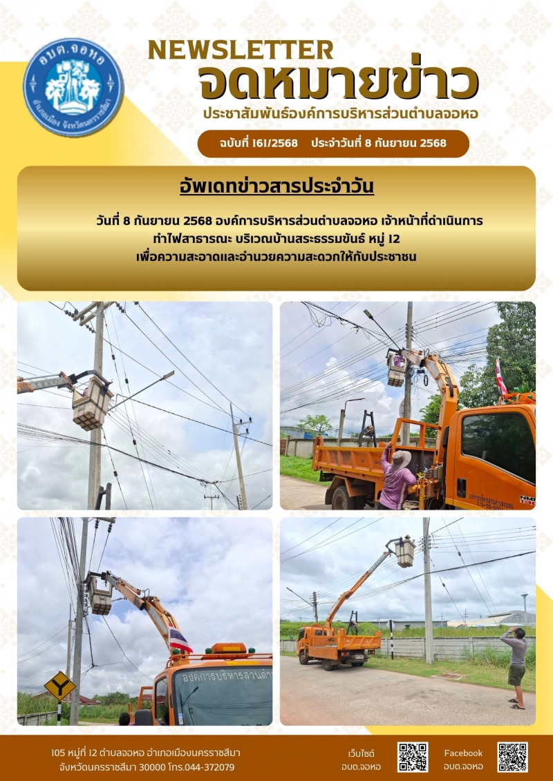 องค์การบริหารส่วนตำบลจอหอ ขอเผยแพร่ ข้อมูล ข่าวสาร กิจกรรม ผลการดำเนินงาน ขององค์การบริหารส่วนตำบลจอหอ ดังนี้ จดหมายข่าว ฉบับประจำวันวันที่ 8 กันยายน 2568