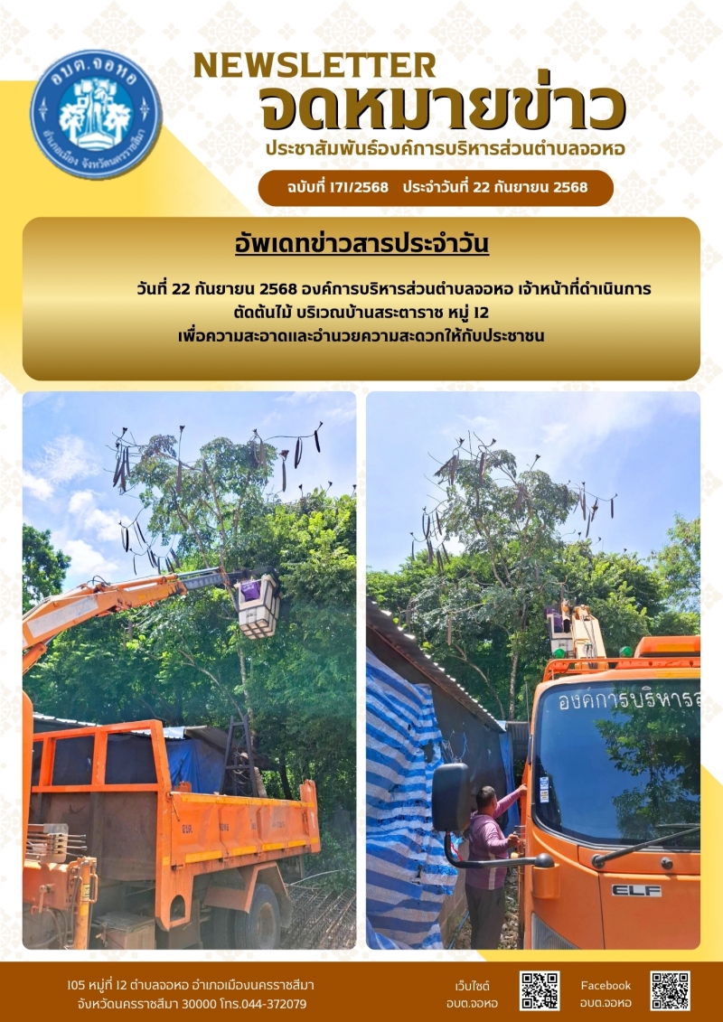 องค์การบริหารส่วนตำบลจอหอ ขอเผยแพร่ ข้อมูล ข่าวสาร กิจกรรม ผลการดำเนินงาน ขององค์การบริหารส่วนตำบลจอหอ ดังนี้ จดหมายข่าว ฉบับประจำวันวันที่ 22 กันยายน 2568