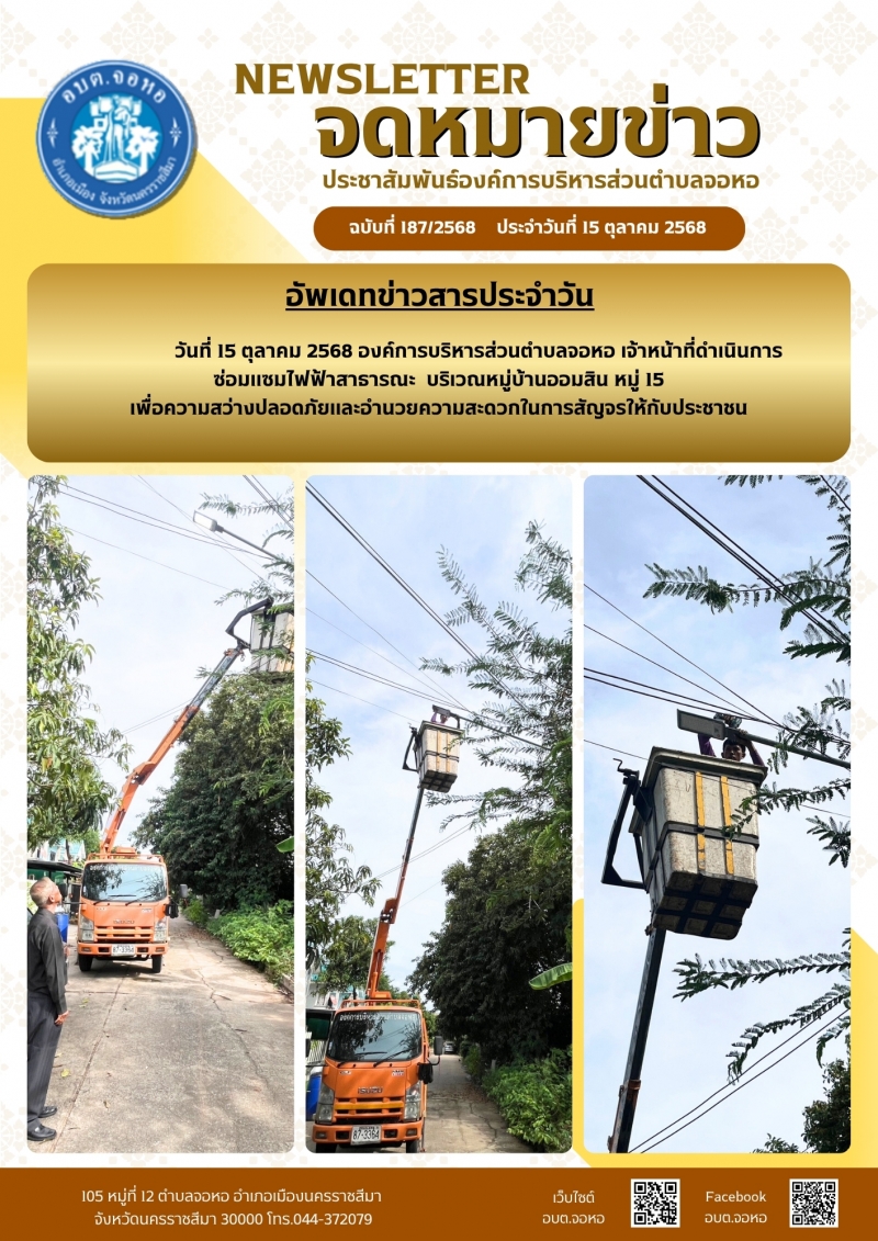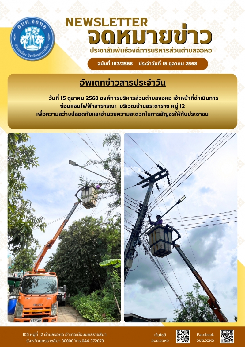 องค์การบริหารส่วนตำบลจอหอ ขอเผยแพร่ ข้อมูล ข่าวสาร กิจกรรม ผลการดำเนินงาน ขององค์การบริหารส่วนตำบลจอหอ ดังนี้ จดหมายข่าว ฉบับประจำวันวันที่ 15 ตุลาคม 2568