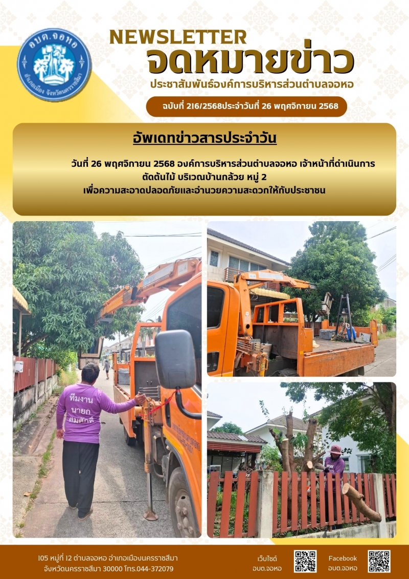 องค์การบริหารส่วนตำบลจอหอ ขอเผยแพร่ ข้อมูล ข่าวสาร กิจกรรม ผลการดำเนินงาน ขององค์การบริหารส่วนตำบลจอหอ ดังนี้ จดหมายข่าว ฉบับประจำวันวันที่ 26 พฤศจิกายน 2568