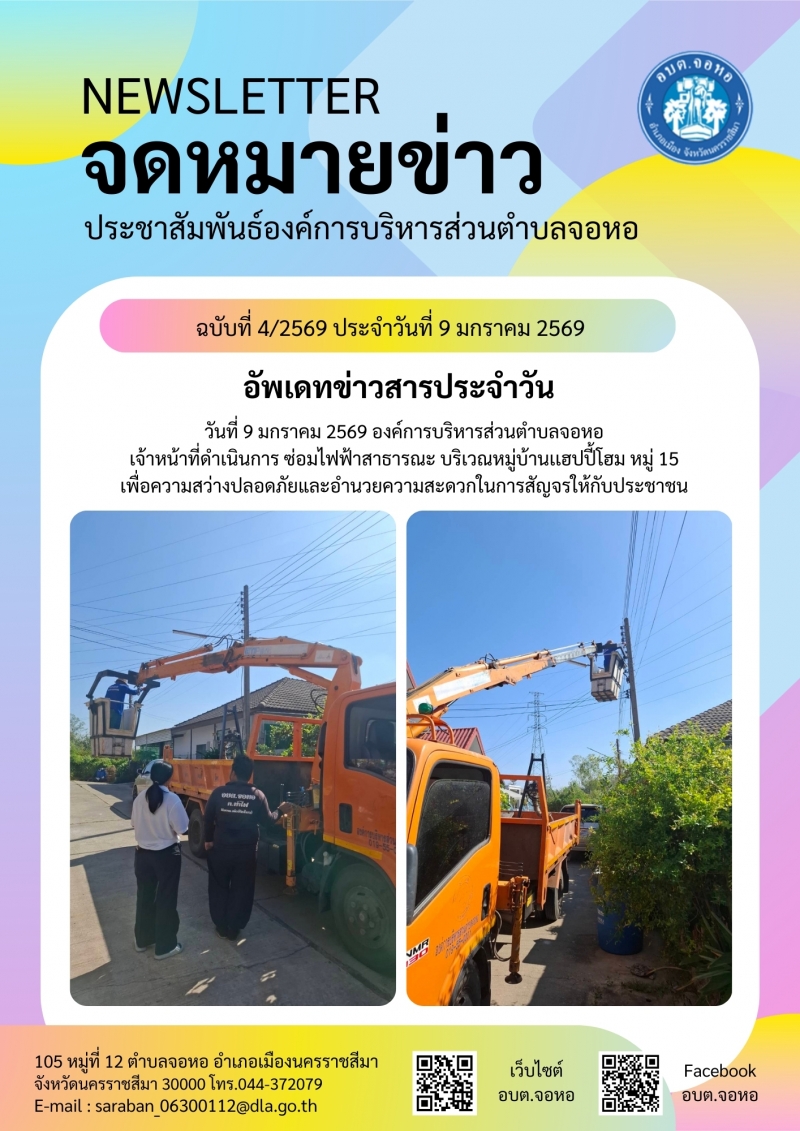 องค์การบริหารส่วนตำบลจอหอ ขอเผยแพร่ ข้อมูล ข่าวสาร กิจกรรม ผลการดำเนินงาน ขององค์การบริหารส่วนตำบลจอหอ ดังนี้ จดหมายข่าว ฉบับประจำวันวันที่ 9 มกราคม 2569