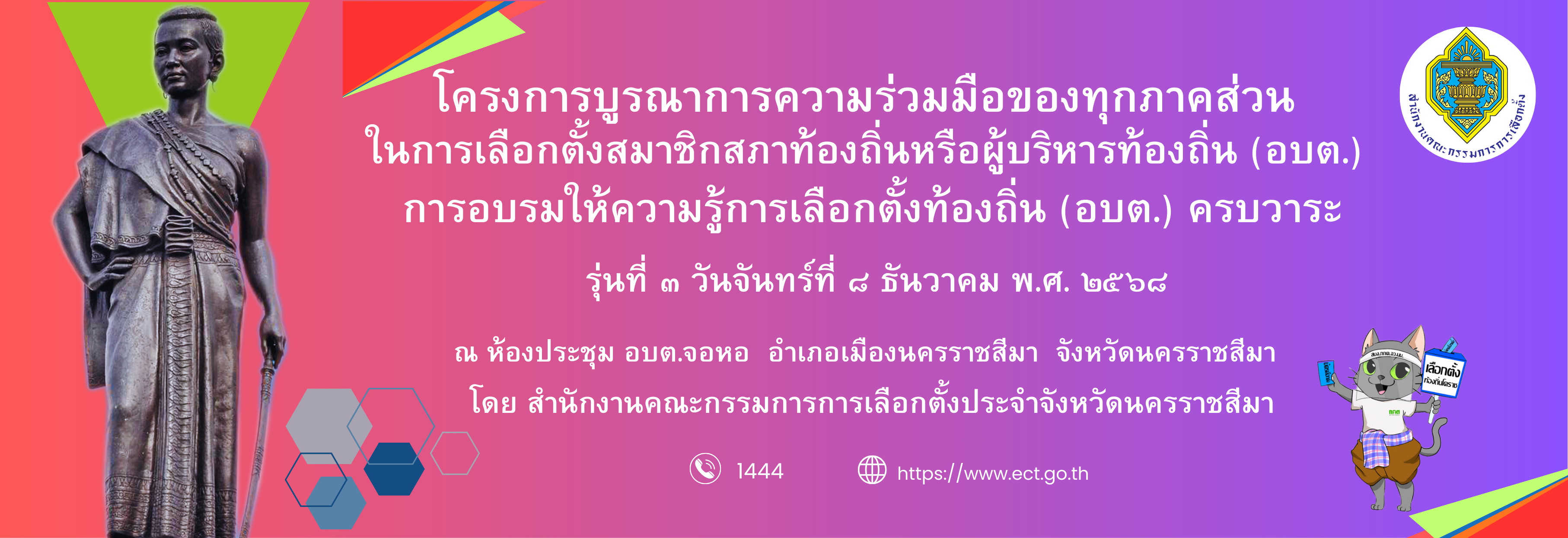 ขอเชิญผู้สมัครรับเลือกตั้ง สมาชิกสภาองค์การบริหารส่วนตำบลจอหอและนายกองค์การบริหารส่วนตำบลจอหอ เข้าร่วมโครงการบูรณาการความร่วมมือของทุกภาคส่วนในการเลือกตั้งสมาชิกสภาท้องถิ่นหรือผู้บริหารท้องถิ่น (อบต.) การอบรมให้ความรู้การเลือกตั้งท้องถิ่น (อบต.) ครบวาระ ร