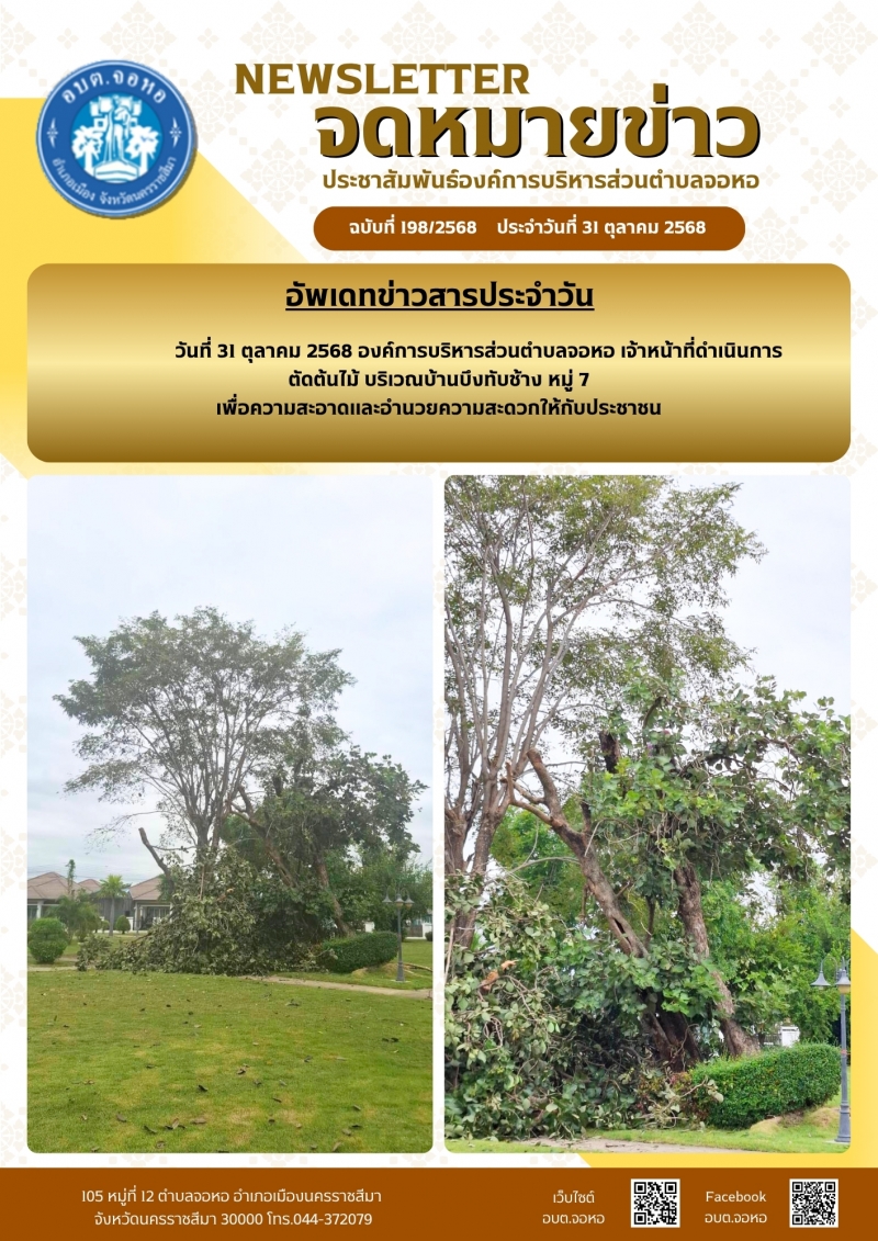 องค์การบริหารส่วนตำบลจอหอ ขอเผยแพร่ ข้อมูล ข่าวสาร กิจกรรม ผลการดำเนินงาน ขององค์การบริหารส่วนตำบลจอหอ ดังนี้ จดหมายข่าว ฉบับประจำวันวันที่ 31 ตุลาคม 2568