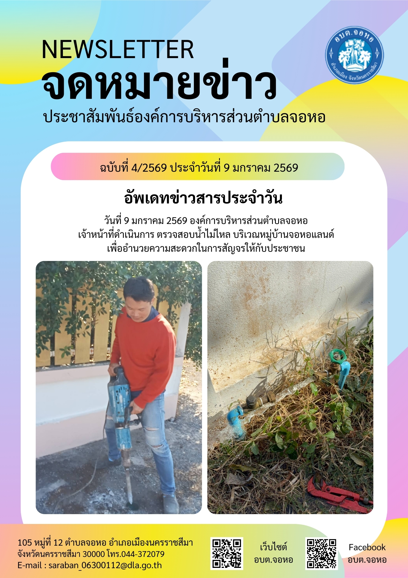 องค์การบริหารส่วนตำบลจอหอ ขอเผยแพร่ ข้อมูล ข่าวสาร กิจกรรม ผลการดำเนินงาน ขององค์การบริหารส่วนตำบลจอหอ ดังนี้ จดหมายข่าว ฉบับประจำวันวันที่ 9 มกราคม 2569