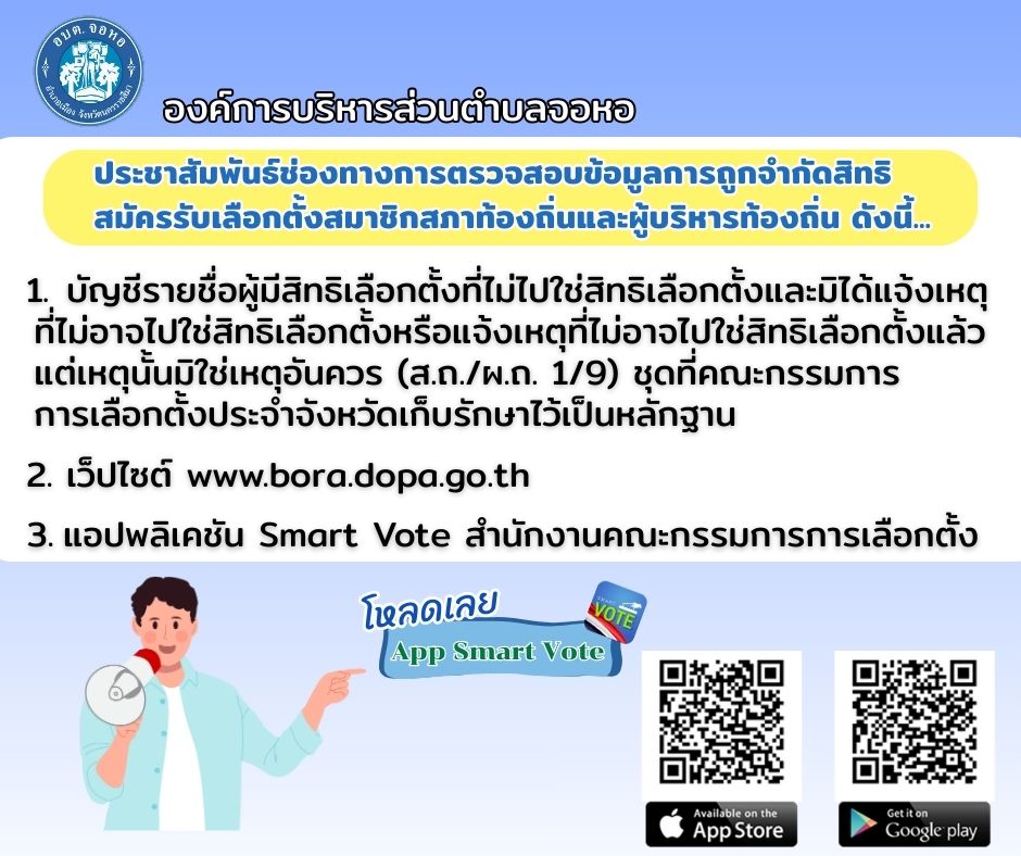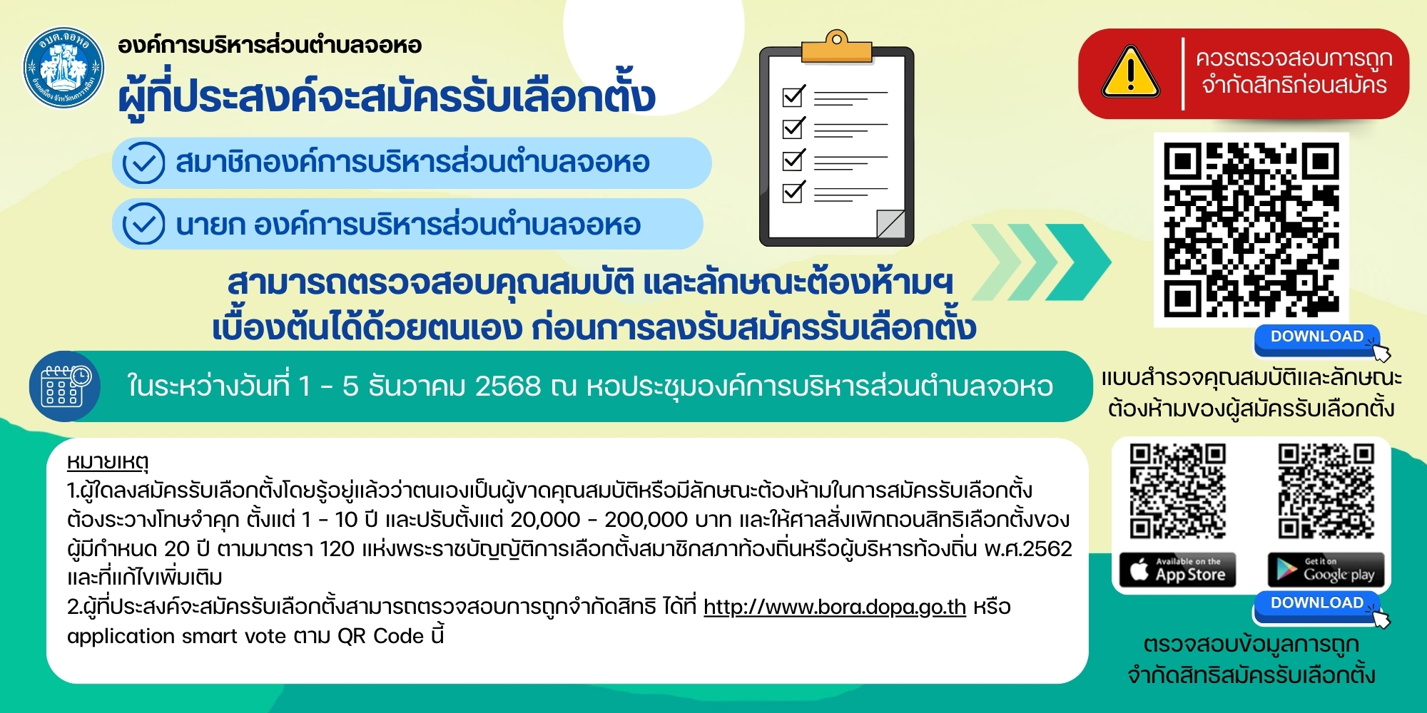 ผู้ที่ประสงค์จะสมัครรับเลือกตั้งเป็นนายกองค์การบริหารส่วนตำบลจอหอ และสมาชิกสภาองค์การบริหารส่วนตำบลจอหอ สามารถตรวจสอบคุณสมบัติ และลักษณะต้องห้ามฯ เบื้องต้นได้ด้วยตนเอง ที่นี่
