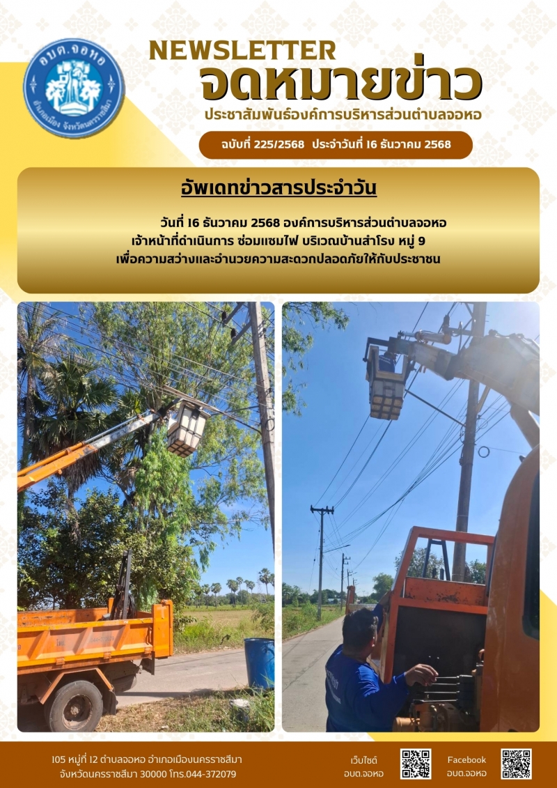 องค์การบริหารส่วนตำบลจอหอ ขอเผยแพร่ ข้อมูล ข่าวสาร กิจกรรม ผลการดำเนินงาน ขององค์การบริหารส่วนตำบลจอหอ ดังนี้ จดหมายข่าว ฉบับประจำวันวันที่ 16 ธันวาคม 2568
